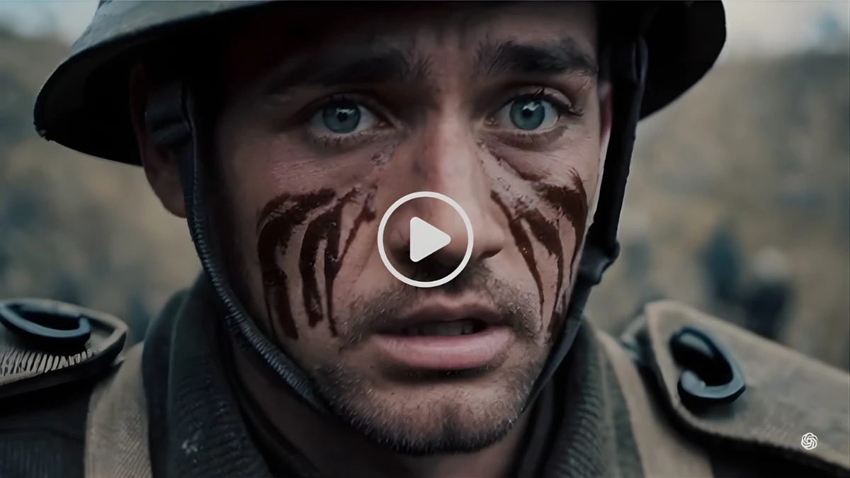 Пример подсказок для разных жанров — Кинематографическая драма, 15 секунд. Сцена: реалистичная окопная зона Первой мировой войны во время атаки; солдат в шлеме бежит по узким, залитым грязью окопам. Камера: динамичная слежащая съёмка, затем переход на замедленный эмоциональный крупный план.