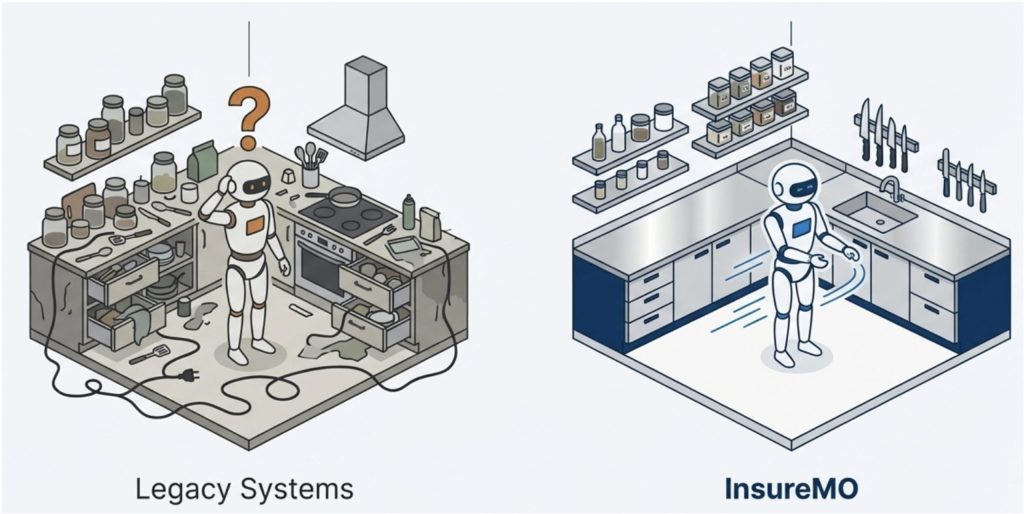 Тот же робот; те же ингредиенты; совершенно разные результаты. Разница не в «интеллекте» робота, а в том, подготовлена ли среда для машинного использования. Большинство страховых API напоминают первую, неорганизованную кухню.